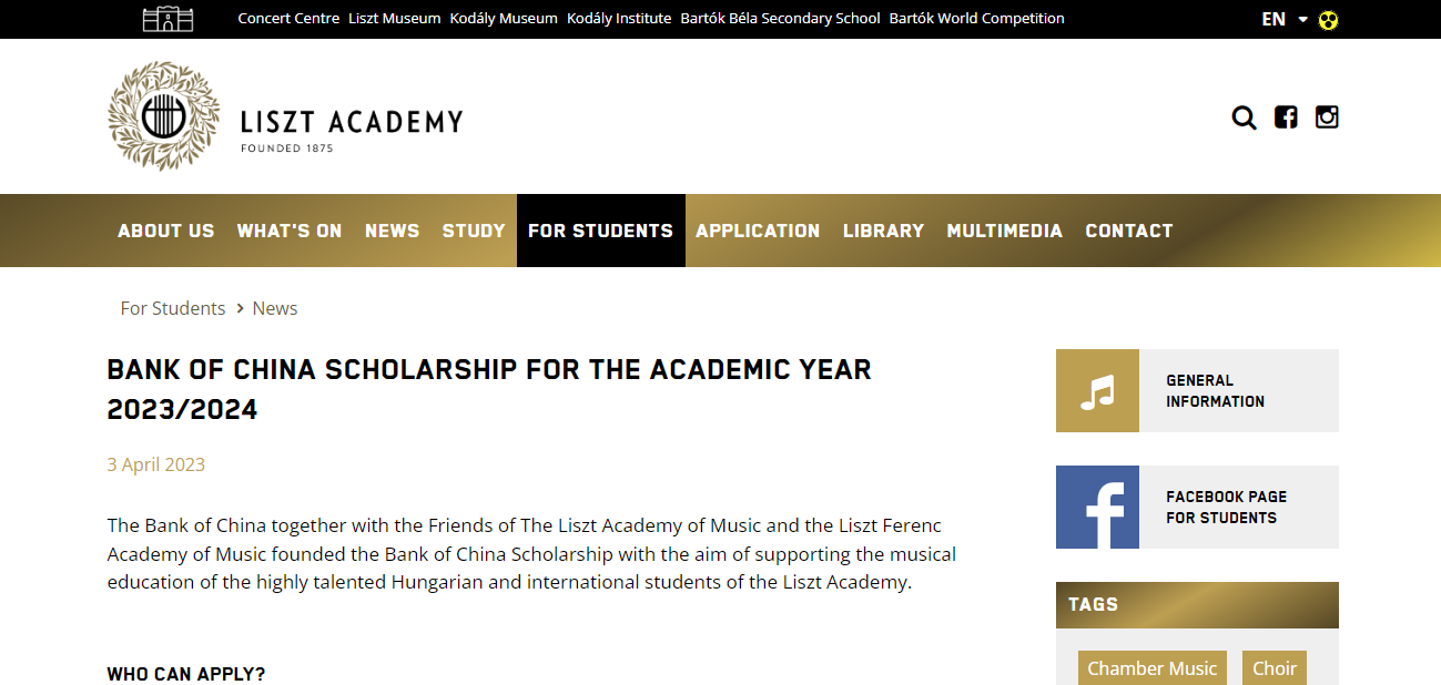 The Liszt Ferenc Academy of Music has announced the Bank of China Scholarship to support the musical education of talented Hungarian and international students.