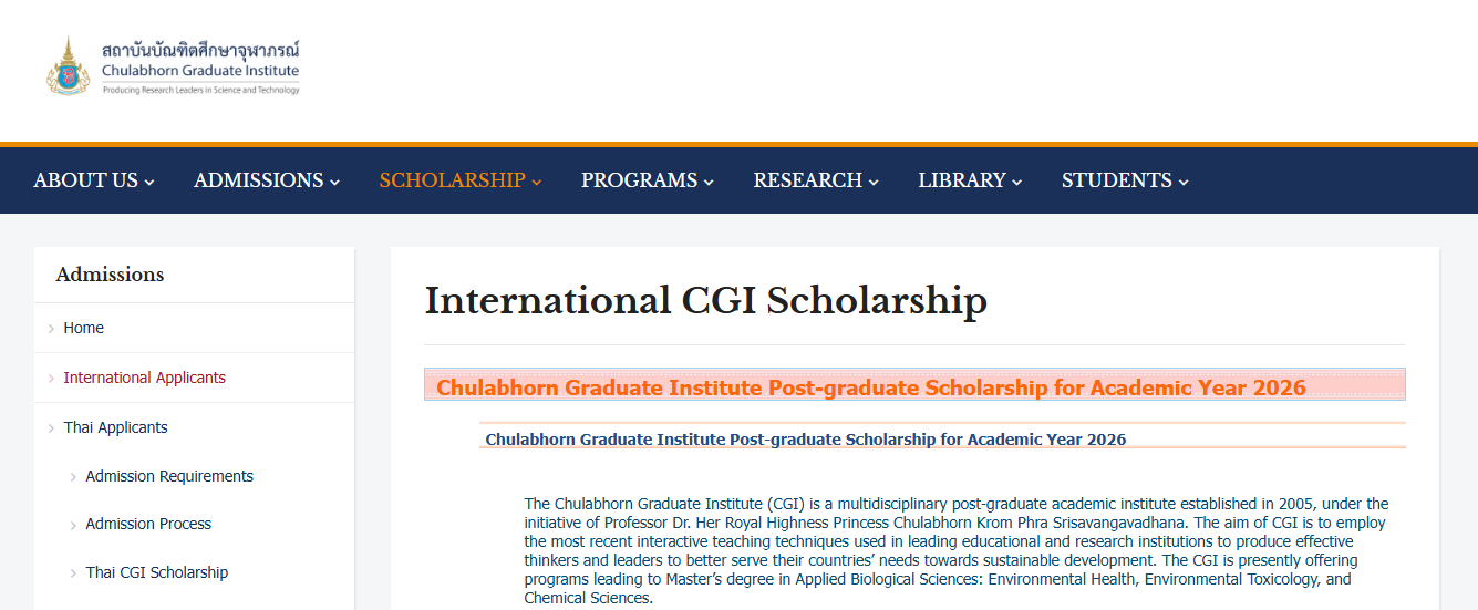 The CGI is currently offering 15 scholarships leading to a Master’s Degree for international students. All students are eligible except Thai citizens. There is no application fee charged by the Chulabhorn Institute. Selection of applicants will be based on merit. The duration of the scholarship is 2 years.