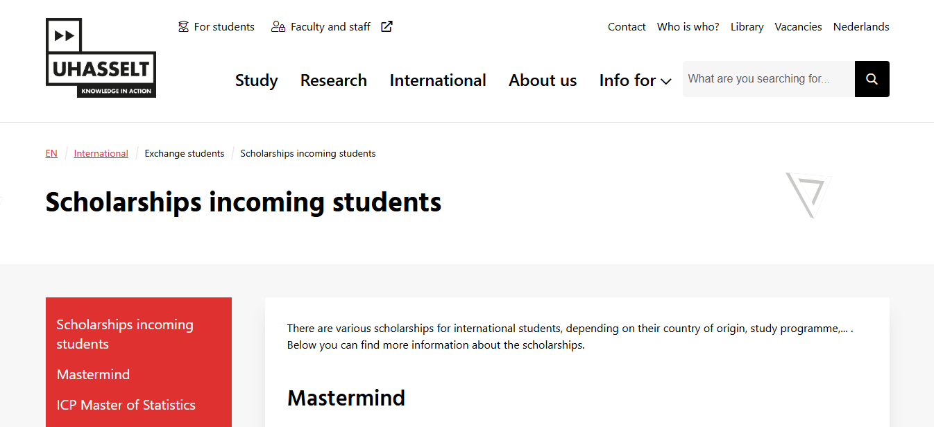 Are you a high-achieving international student seeking to study a master's degree in Belgium? The Master Mind Scholarship, funded by the Flemish Ministry of Education and Training, offers financial assistance and a tuition fee remission to excellent students enrolled at Hasselt.
