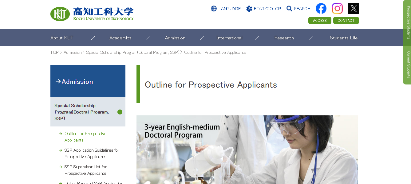 The aim of the Kochi University Special Scholarship Program (SSP) is to support the development of advanced Research at the University by inviting Researchers from around the world. The KUT Special Scholarship Program is a 3-year doctoral Scholarship with a strong interest in engaging in Research.
