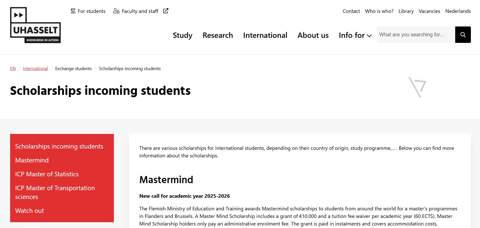 Are you an ambitious student looking for a fantastic opportunity to pursue a master's degree in Europe? The Master Mind Scholarship at Hasselt University, Belgium, is now accepting applications for the academic year 2025-26. The Flemish Ministry of Education and Training has established this prestigious, fully funded scholarship to encourage outstanding international students to study in Flanders and Brussels.