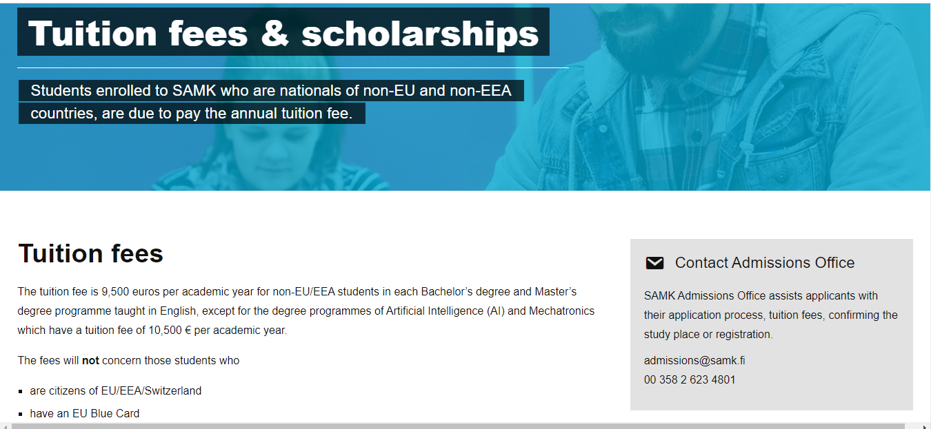According to the Finnish Parliament decision, Finnish universities charge tuition fees from non-EU/EEA students. At the University of Vaasa, tuition fees vary from 10,000 to 12,000 euros per academic year, and are billed to degree students in international master's degree programmes.